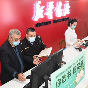 11月7日,在湖州市吴兴区爱山街道一家书店,综合执法队工作人员对其进货清单进行查验。
