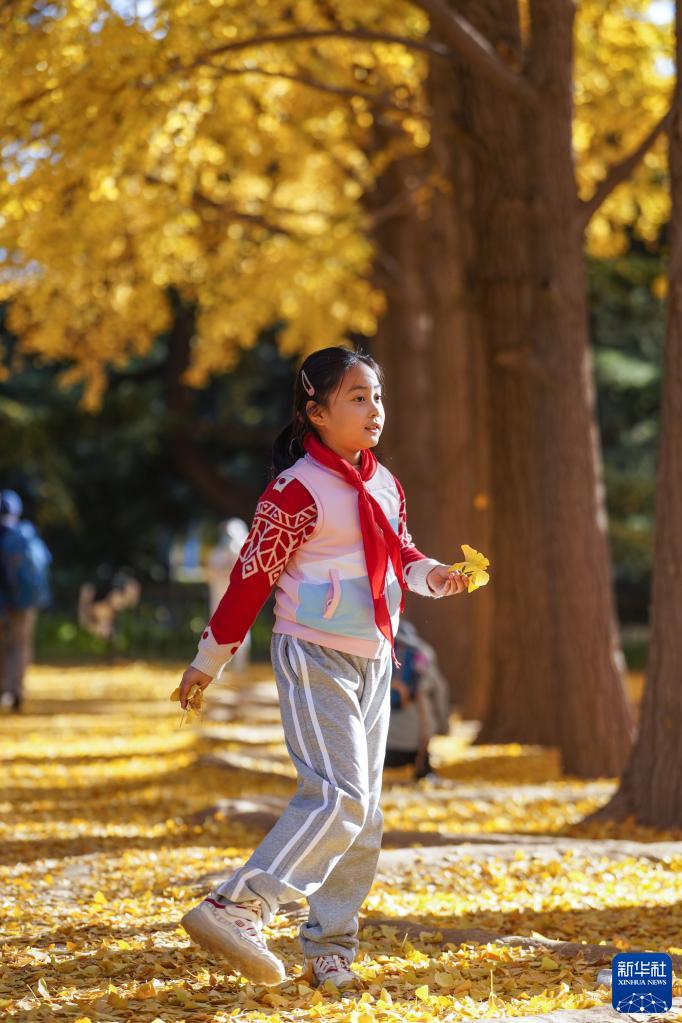 11月7日,一个小女孩在北京钓鱼台国宾馆旁的银杏大道上玩耍。