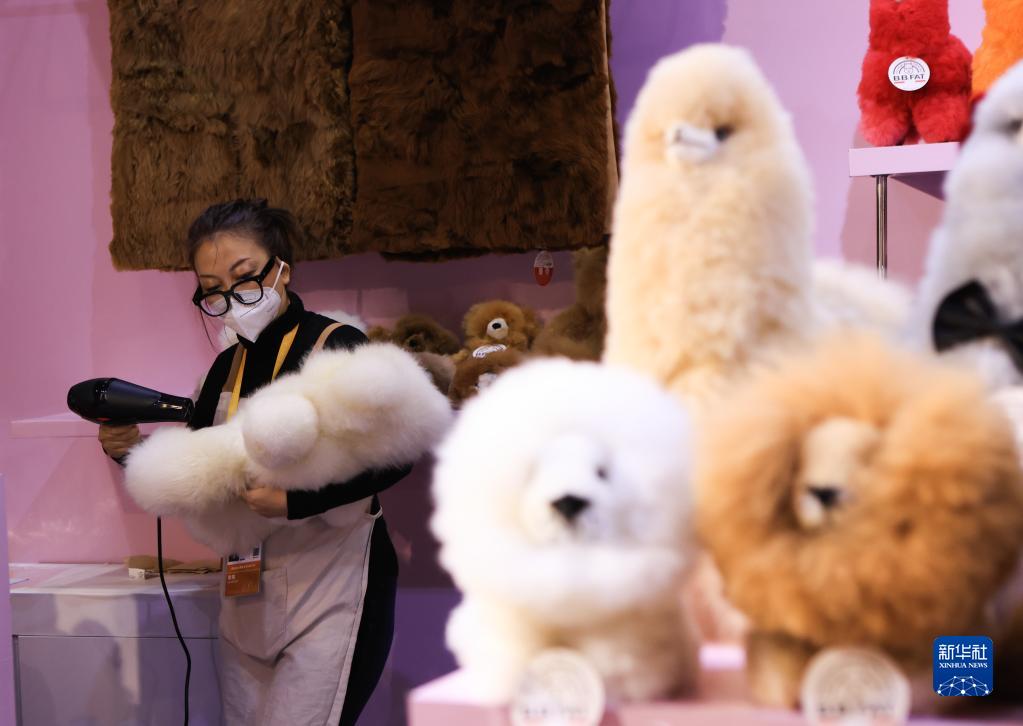 在第五届进博会上,来自澳大利亚、新西兰和秘鲁的展商“不约而同”展出羊驼毛制品,蓬松柔软、形态各异的动物玩偶在展台“列队”,吸引大批观众前来交流洽谈,为进博会增添一抹可爱的亮色。