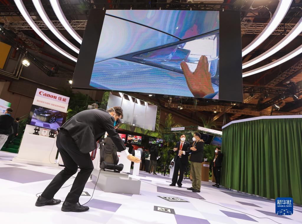 11月7日,展商在第五届进博会佳能展台演示MR虚拟现实系统。