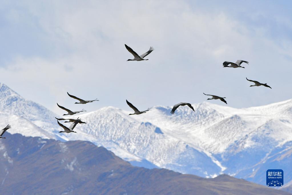 黑颈鹤在林周县山峦间盘旋(11月6日摄)。
