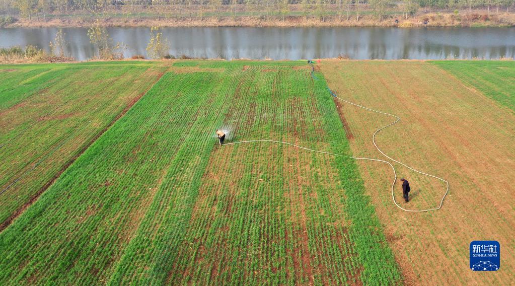 11月8日,山东省临沂市郯城县郯城街道农民在麦田间浇水(无人机照片)。