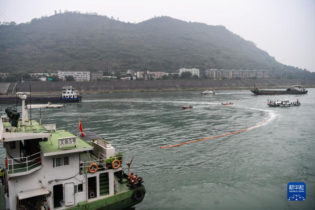 11月9日,在四川省宜宾市叙州区,多方部门协作在金沙江面布设围油栏。
