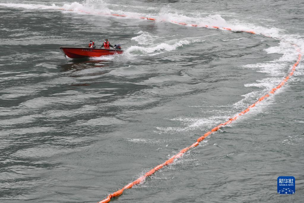 11月9日,在四川省宜宾市叙州区,演练人员驾驶快艇查看围油栏布设情况。