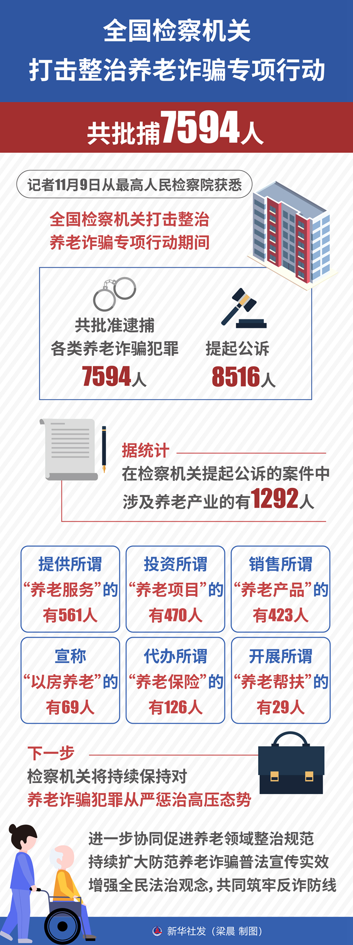 新华社北京11月9日电(记者刘奕湛、任沁沁)记者9日从最高人民检察院获悉,全国检察机关打击整治养老诈骗专项行动期间,共批准逮捕各类养老诈骗犯罪7594人,提起公诉8516人。