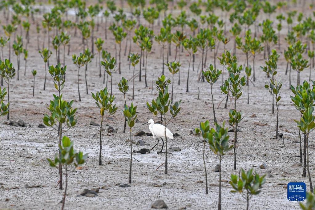 11月8日,鹭鸟在海南省儋州市新英盐场湿地人工栽种的红树林间觅食。新华社记者 蒲晓旭 摄