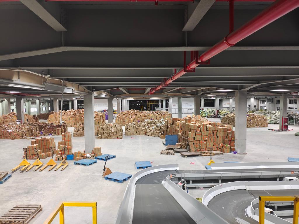 这是“双11”期间,位于杭州的申通快递华东分拨中心的现场运转情况。新华社记者张璇摄