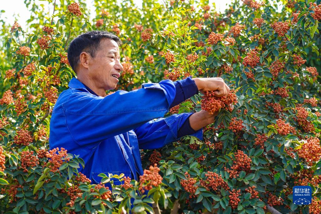 在山西省运城市芮城县风陵渡镇,椒农在采摘花椒(2022年8月31日摄)。新华社发