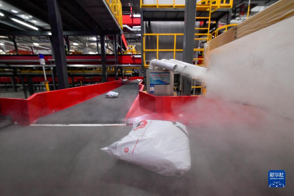 11月9日,在顺丰速运天津全自动中转枢纽,雾化消杀设备对快递包裹进行消杀。