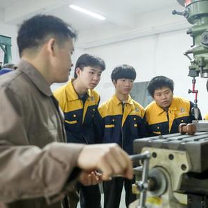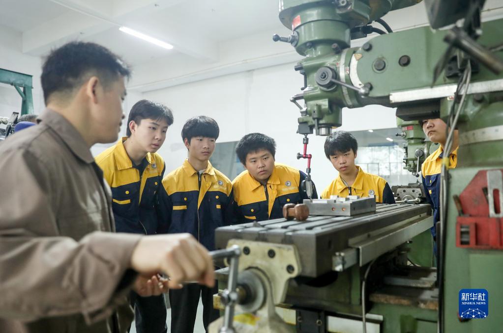 11月9日,华蓥市一家光电仪器企业技师在车间内给职业教育培训中心的学生现场讲解机床的操作技术。