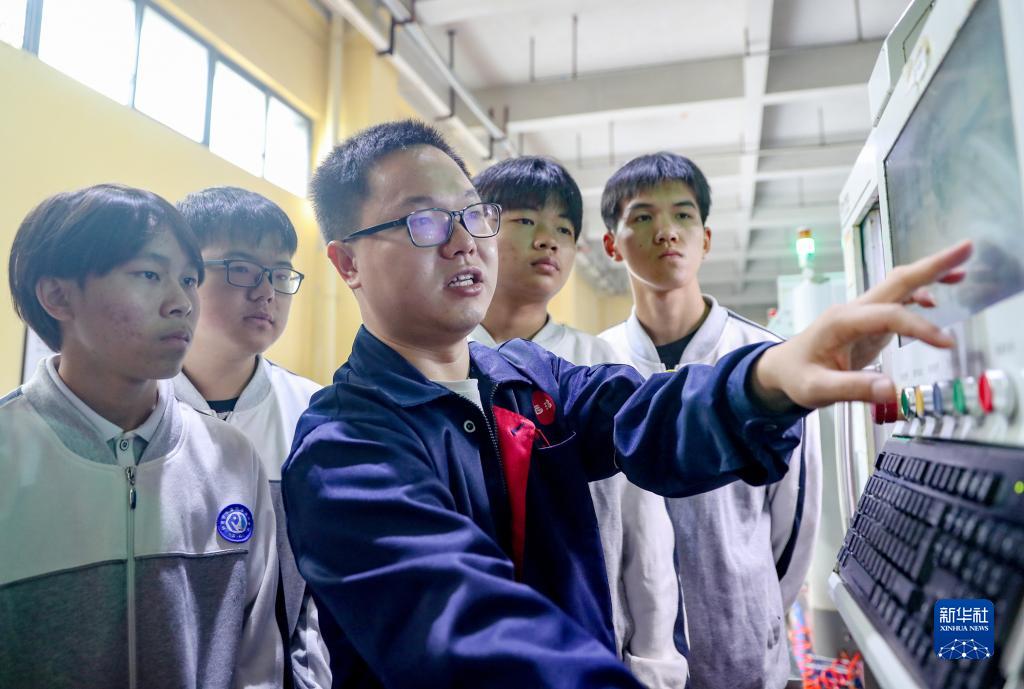 11月9日,华蓥市一家电子产品企业技师在给职业教育培训中心的学生讲解生产设备操作技术。