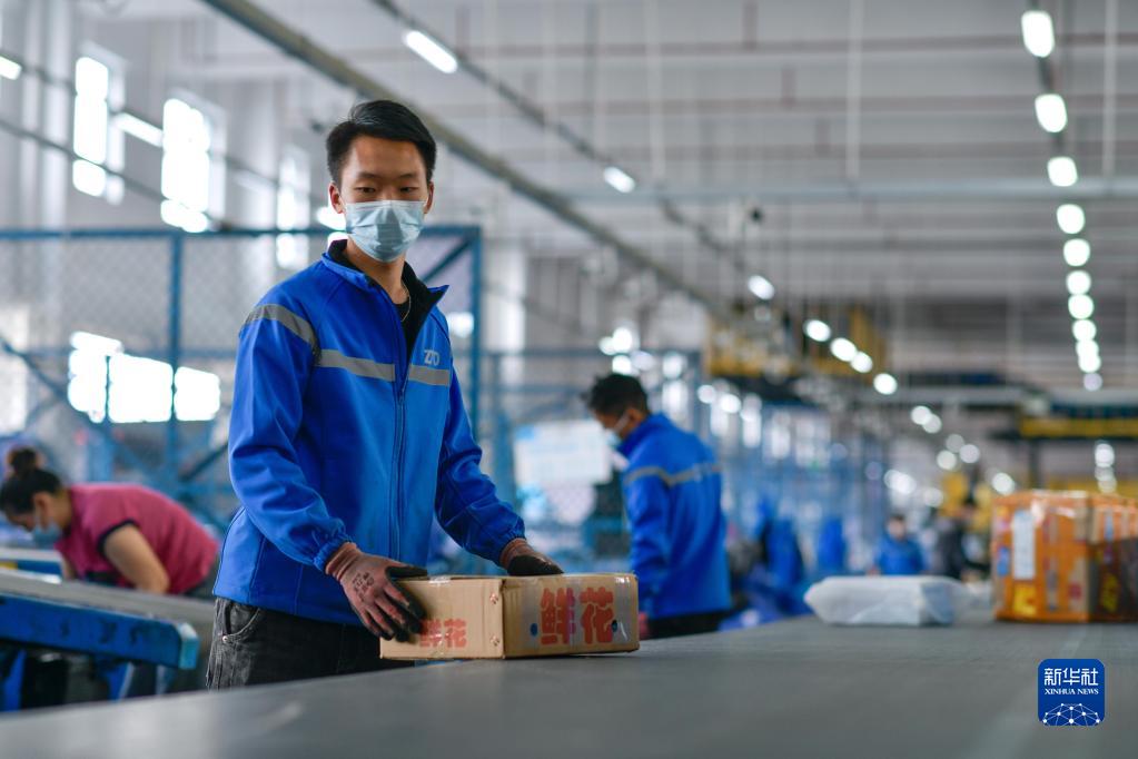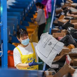 11月10日,工作人员在位于贵州省龙里县的贵州快递物流园一家快递分拨中心分拣快递。