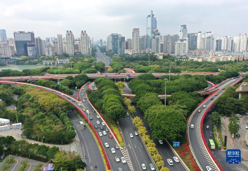初冬时节,广西南宁市树绿花红,丰富的色彩扮靓了城市。