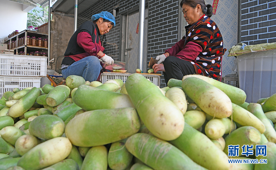 11月8日,安徽省淮南市寿县堰口镇十字路街道电商经营户组织村民腌制萝卜。