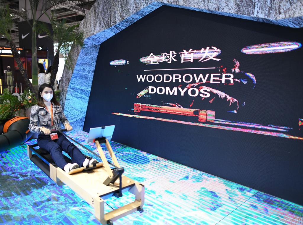 11月8日,参观者在第五届进博会上体验多功能陆地划船机。新华社记者戴天放 摄