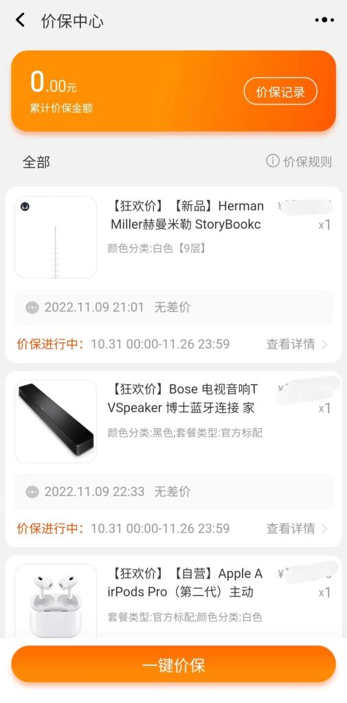 图为某电商App“一键价保”页面。