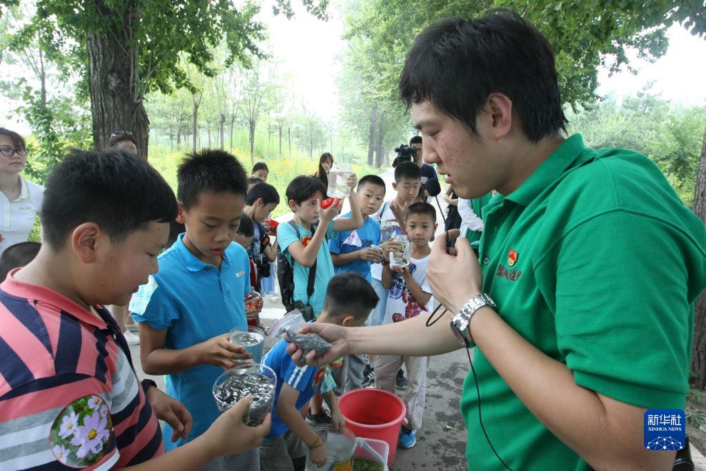 在翠湖国家城市湿地公园,张庚(右一)在科普活动中为小朋友们讲解(2016年7月9日摄)。
