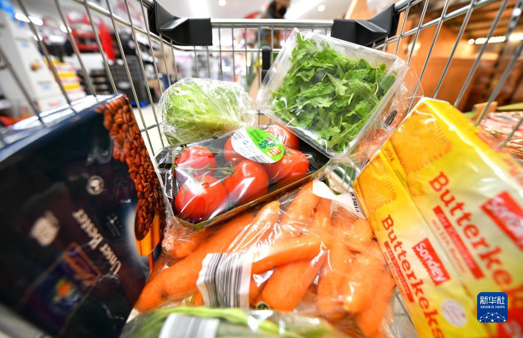 这是11月11日在德国柏林一家超市内拍摄的购物车内的商品。