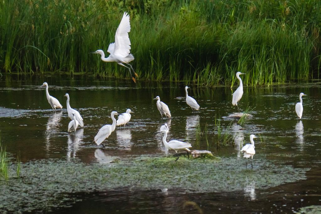 白鹭在柳河带状公园嬉戏。(受访者供图)