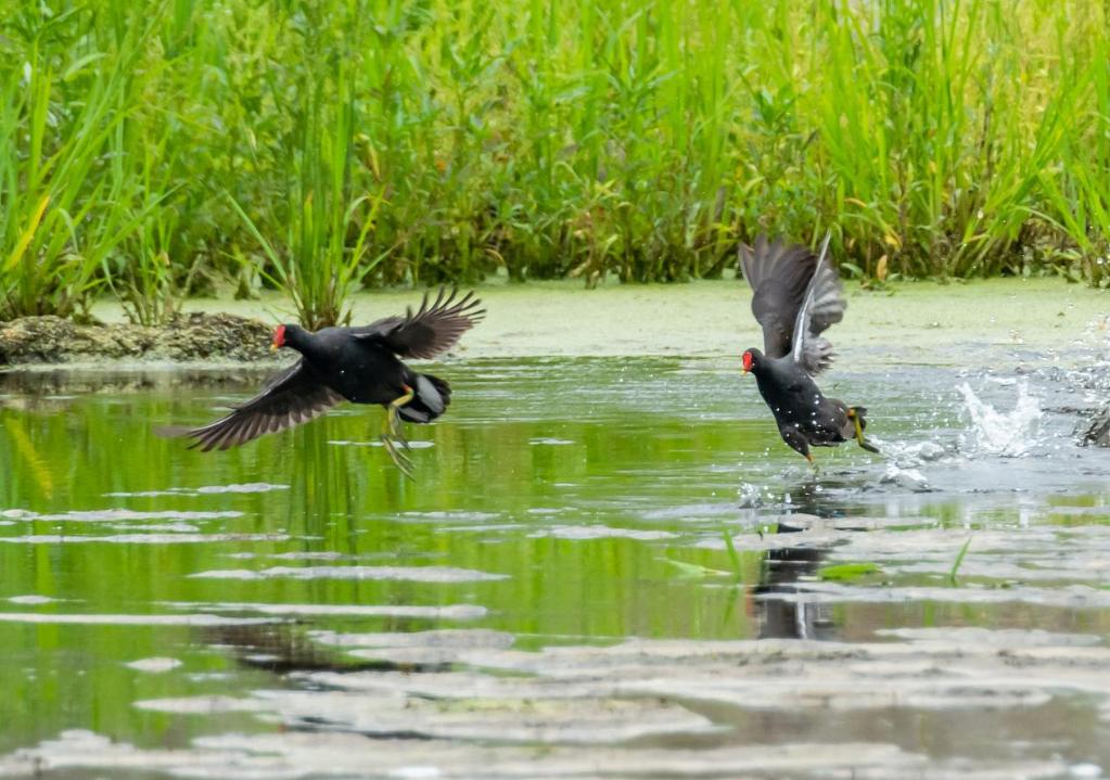 两只黑水鸡从柳河水面一跃而起。(受访者供图)