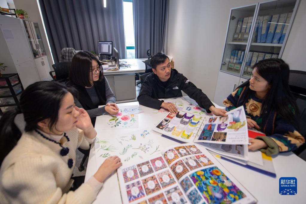 11月2日,在柯桥区的浙江大树纺织科技有限公司,研发部门员工一起讨论新印花的设计。
