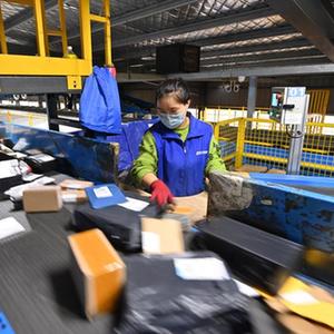 11月11日,浙江省乐清市一家物流企业的工作人员在流水线上分拣快递包裹。(新华社发)