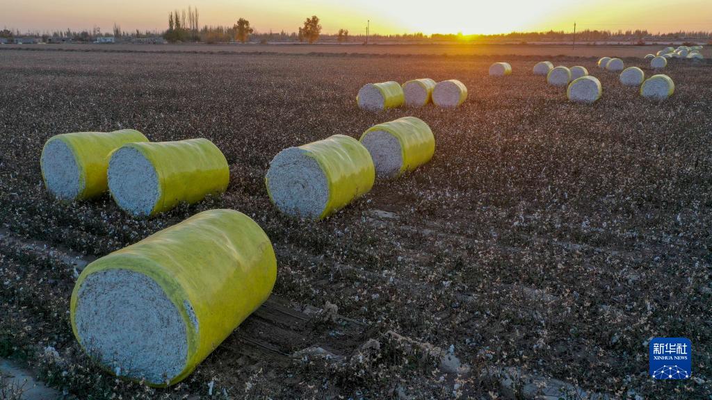 在新疆沙雅县海楼镇一处棉田里拍摄的打包完成的棉花(11月10日,无人机照片)。