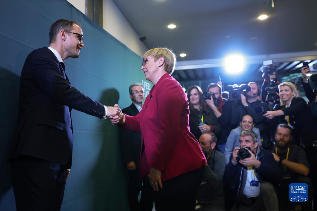 11月13日,在斯洛文尼亚卢布尔雅那,当选总统娜塔莎·皮尔茨·穆萨尔(右)在选举总部接受另一名候选人安热·洛加尔(左)的祝贺。新华社发(泽利科·斯特凡尼奇 摄)