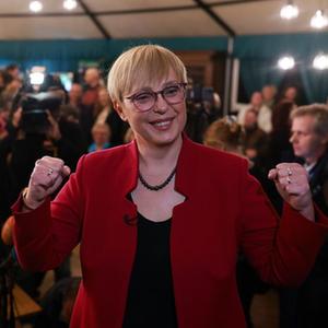 11月13日,在斯洛文尼亚卢布尔雅那,娜塔莎·皮尔茨·穆萨尔在选举结果公布后庆祝当选。新华社发(泽利科·斯特凡尼奇 摄)