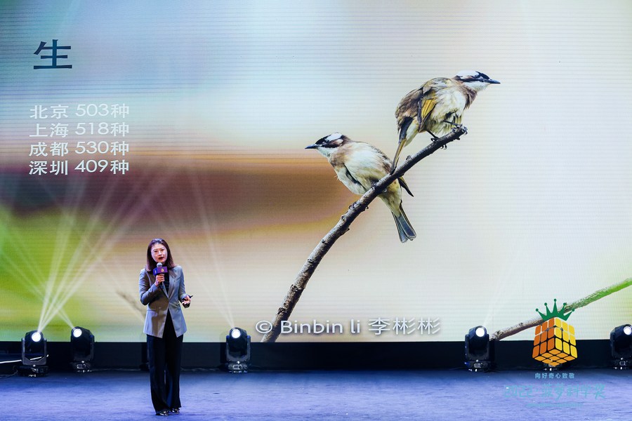 11月12日,2022年度菠萝科学奖在浙江温州颁奖。这是昆山杜克大学环境研究中心李彬彬介绍菠萝科学奖生态奖成果“玻璃幕墙,鸟类墓地”。新华社发(菠萝科学奖组委会供图)