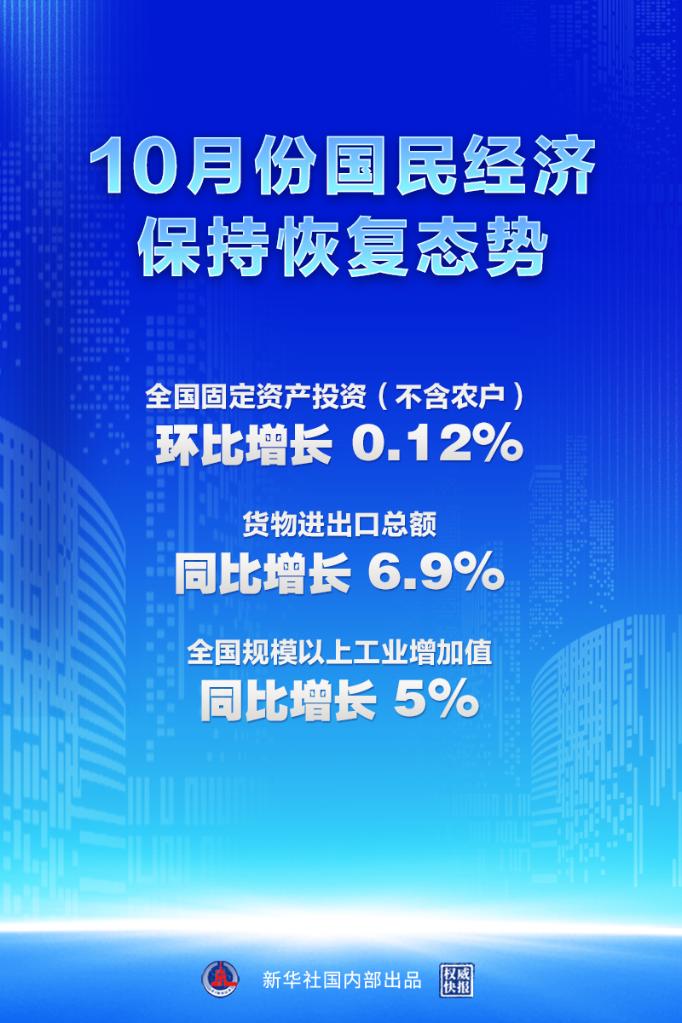 新华社北京11月15日电(记者魏玉坤、周圆)国家统计局15日发布数据显示,10月份,国民经济保持恢复态势,工业投资稳定增长,就业物价总体平稳,新动能积蓄增强,民生保障有力有效,经济社会大局稳定。