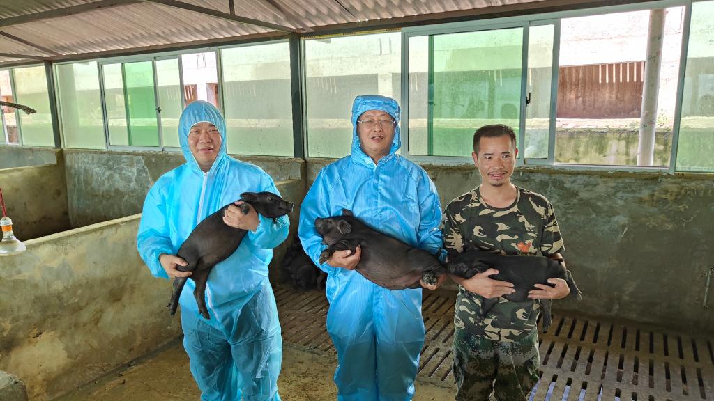 这是印遇龙(中)和农民在一起展示黑猪。受访者供图