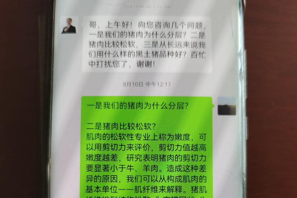 新华社长沙11月14日电(记者周勉)“哥,上午好!向您咨询几个问题,一是我们的猪肉为什么分层?……”这是湖南省常德市桃源县观音寺镇黑猪养殖户李文军,用微信发给被外界亲切地称为“养猪院士”的印遇龙的一条信息。李文军经常用这样的方式请教印遇龙,印遇龙每次都会仔细回复。