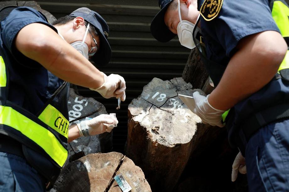 图为中山港海关关员对进口原木实施检查。(拱北海关供图)
