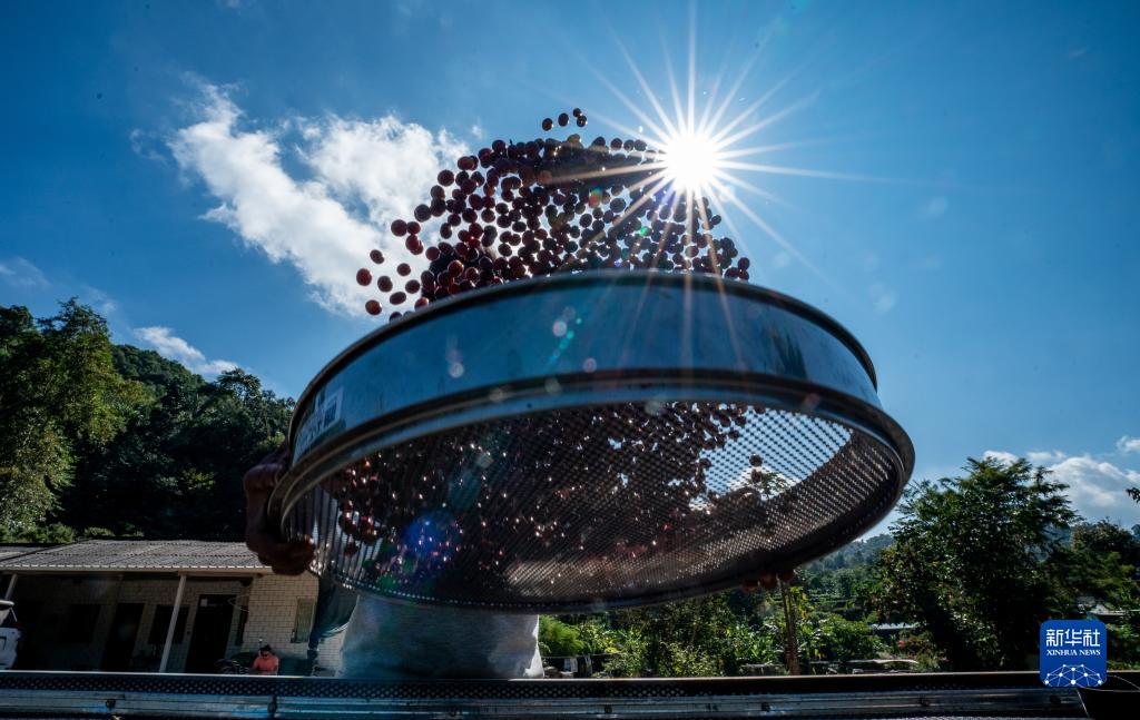 11月16日,在云南省普洱市野鸭塘河谷咖啡庄园,农民在晾晒咖啡果。