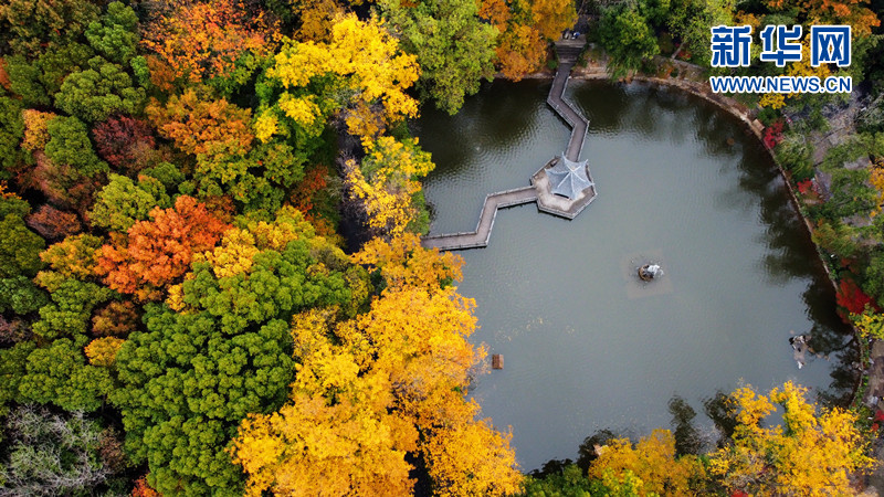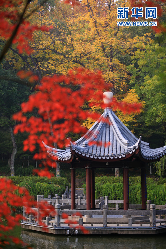 栖霞红叶已进入快速变色期,缤纷的秋叶与池水相映生辉。