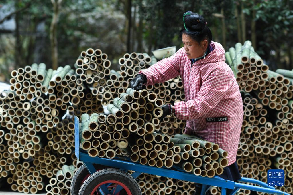 11月17日,在贵州省丹寨县龙泉镇卡拉村,村民在搬运用于制作竹编鸟笼的竹子。