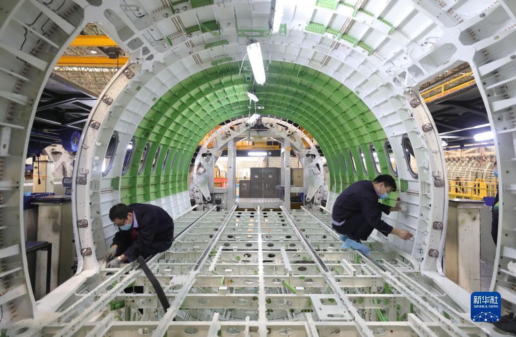 在中航沈飞民用飞机有限责任公司空客A220项目车间,工人在生产飞机(2020年3月6日摄)。新华社记者 杨青 摄