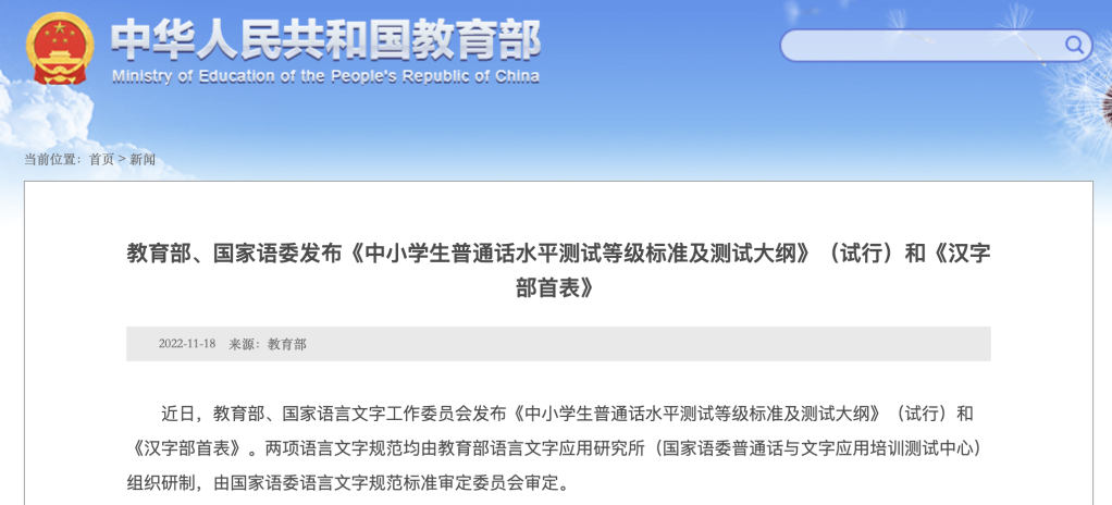 记者11月18日从教育部获悉,教育部、国家语言文字工作委员会近日发布了《中小学生普通话水平测试等级标准及测试大纲》(试行)和《汉字部首表》。