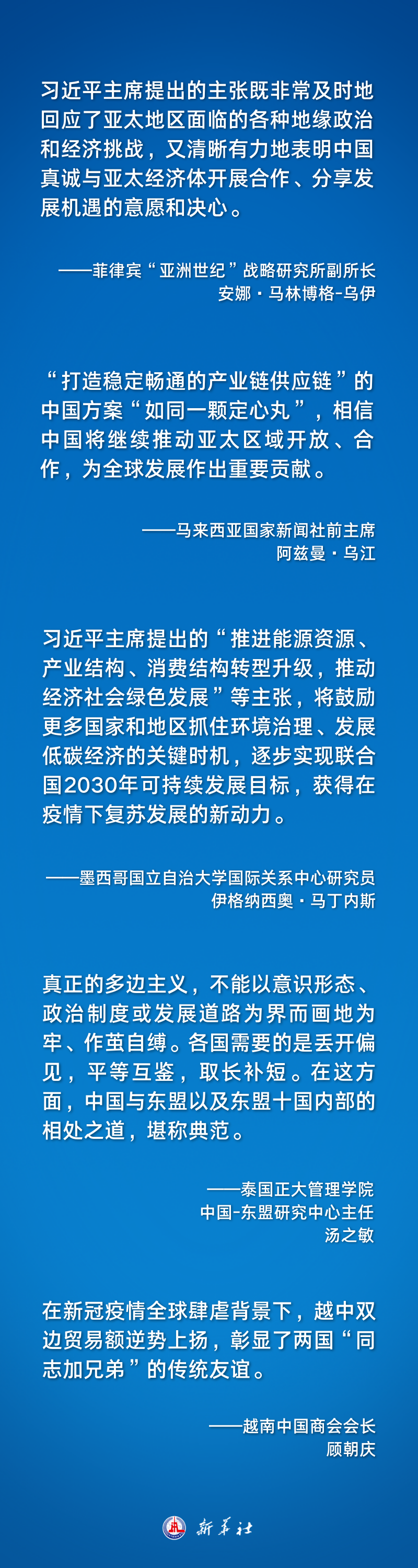 习近平主席的系列重要讲话在国际社会引发热烈反响。多国人士认为,习近平主席全面总结了“亚太奇迹”的经验与启示,就携手构建亚太命运共同体提出重要主张,深刻阐释了中国式现代化的机遇与贡献,为再创亚太合作新辉煌注入强劲动力。