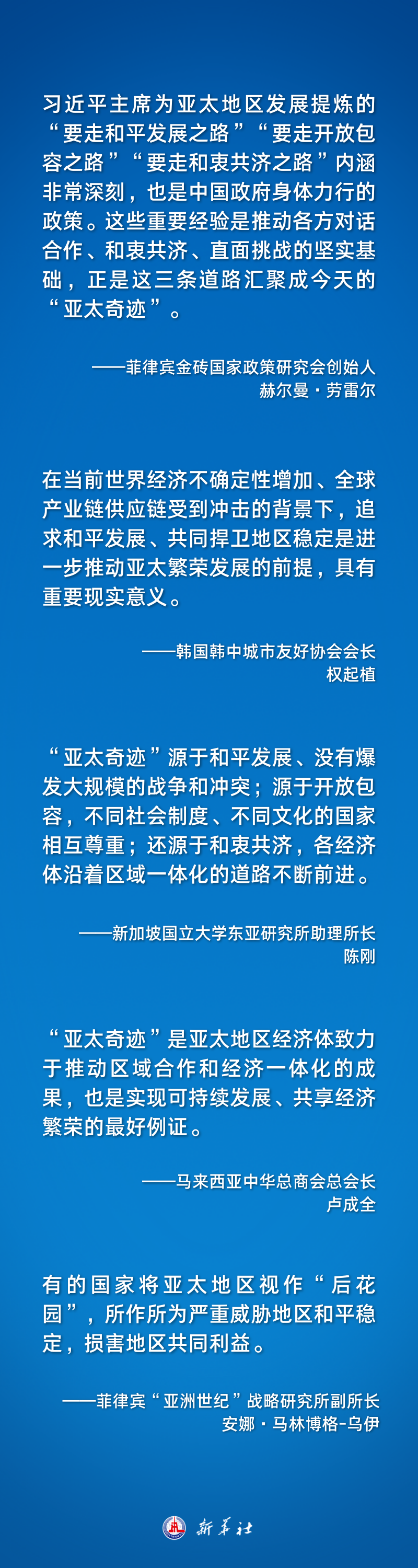 菲律宾金砖国家政策研究会创始人赫尔曼·劳雷尔认为,习近平主席为亚太地区发展提炼的“要走和平发展之路”“要走开放包容之路”“要走和衷共济之路”内涵非常深刻,也是中国政府身体力行的政策。他说,这些重要经验是推动各方对话合作、和衷共济、直面挑战的坚实基础,“正是这三条道路汇聚成今天的‘亚太奇迹’。”