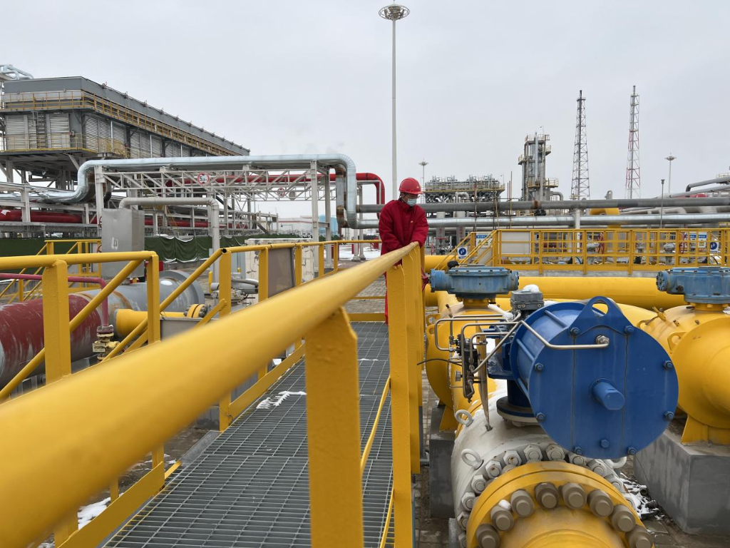呼图壁储气库采气现场,工作人员正在巡检。(新华社发)
