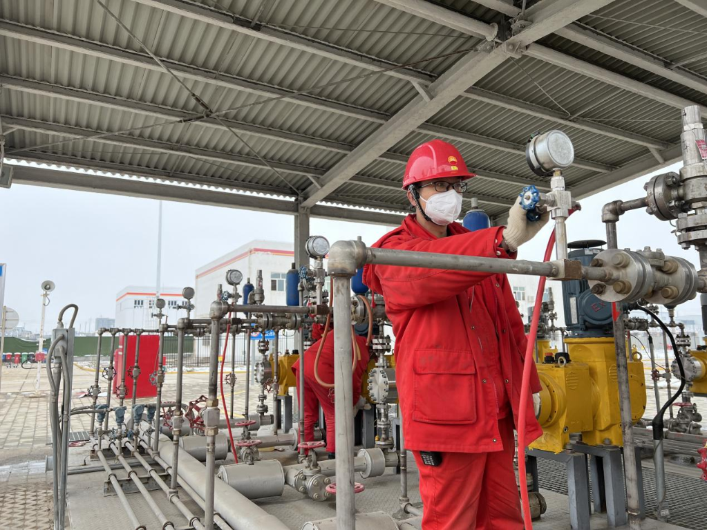 呼图壁储气库采气现场,工作人员正在检查设备。(新华社发)