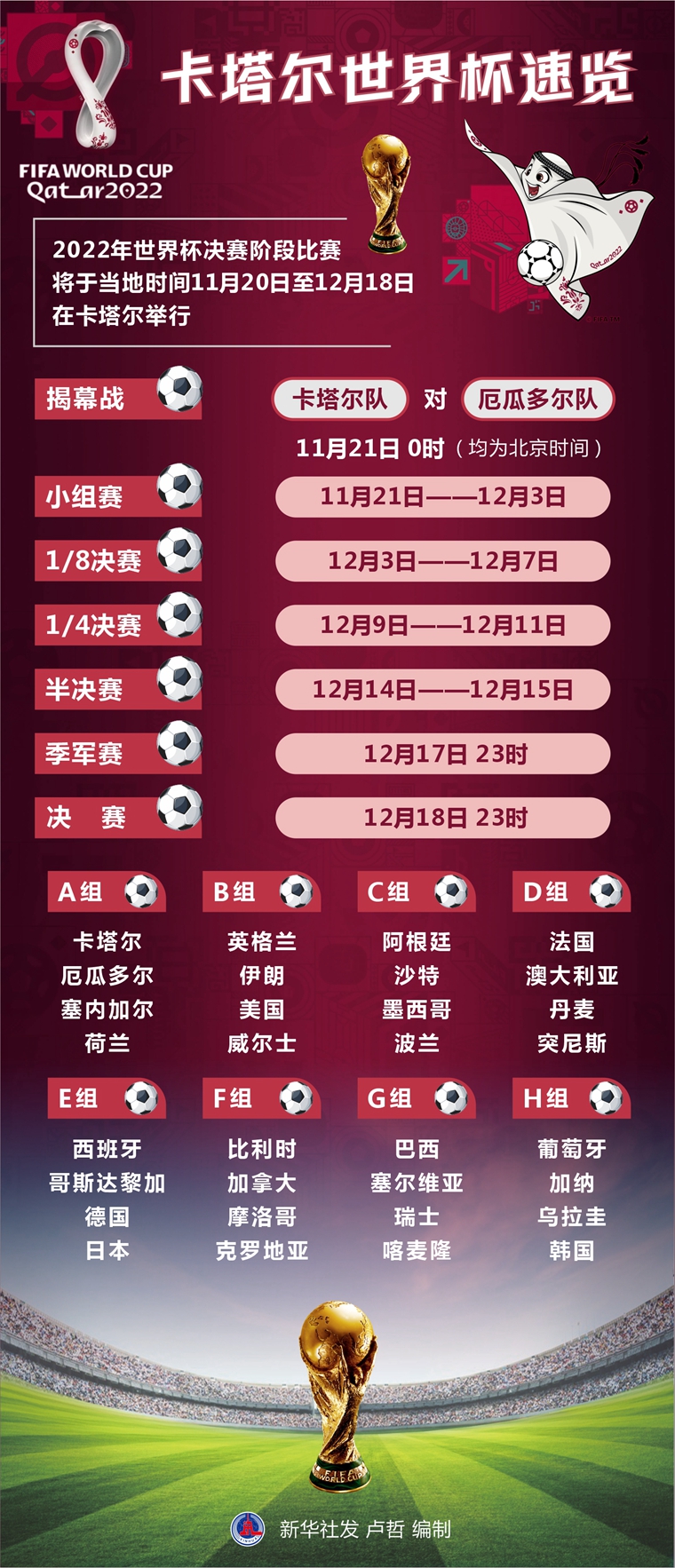 2022年世界杯决赛阶段比赛将于11月20日至12月18日在卡塔尔举行,这也是世界杯首次在中东地区举办。新华社发 卢哲 编制