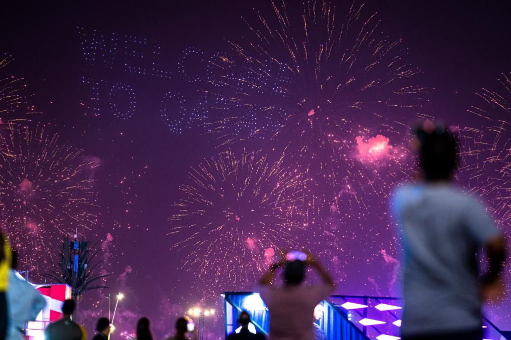 卡塔尔世界杯开幕式前夜,多哈的贝达公园烟花盛放,照亮了整个城市的夜空,这场全世界球迷的盛会即将如约而至。
