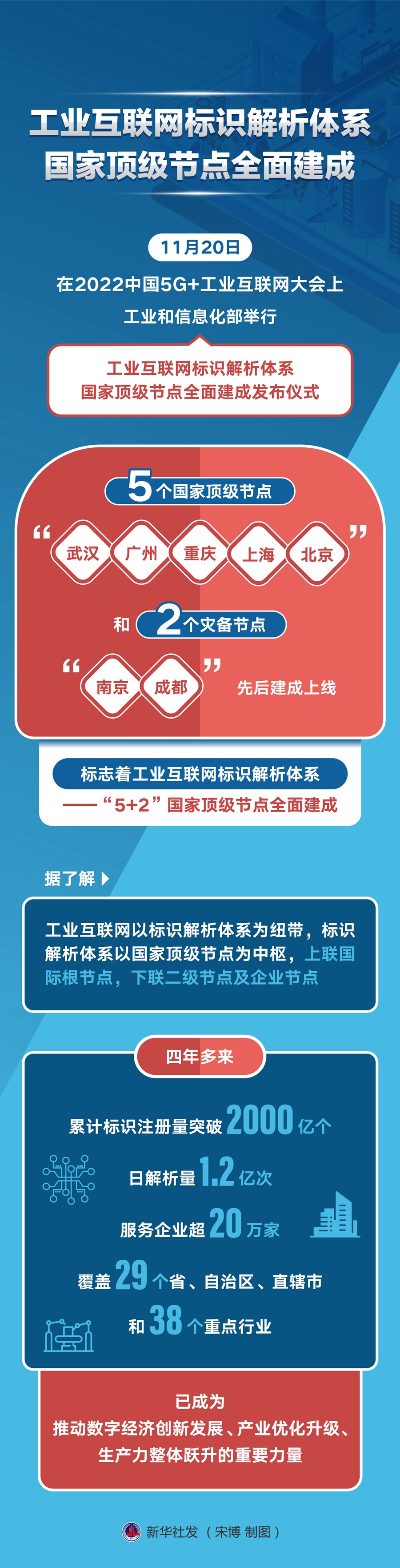 新华社武汉11月20日电(记者徐海波、龚联康)20日,在2022中国5G+工业互联网大会上,工业和信息化部举行工业互联网标识解析体系国家顶级节点全面建成发布仪式,标志着工业互联网标识解析体系——“5+2”国家顶级节点全面建成。