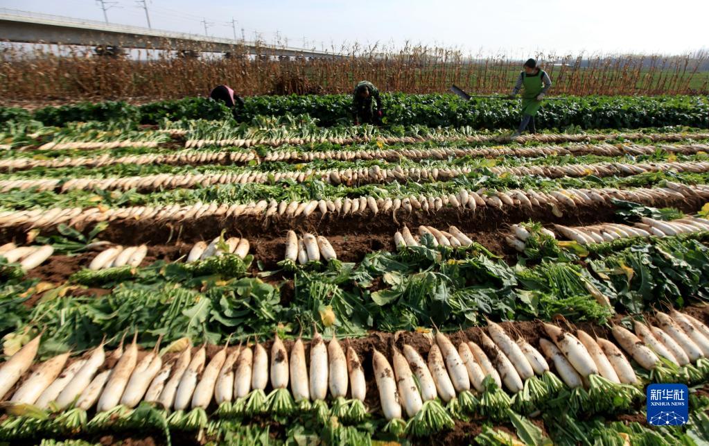 11月20日,在山东省临沂市平邑县地方镇东朱尹村,农民在田间收获白萝卜。