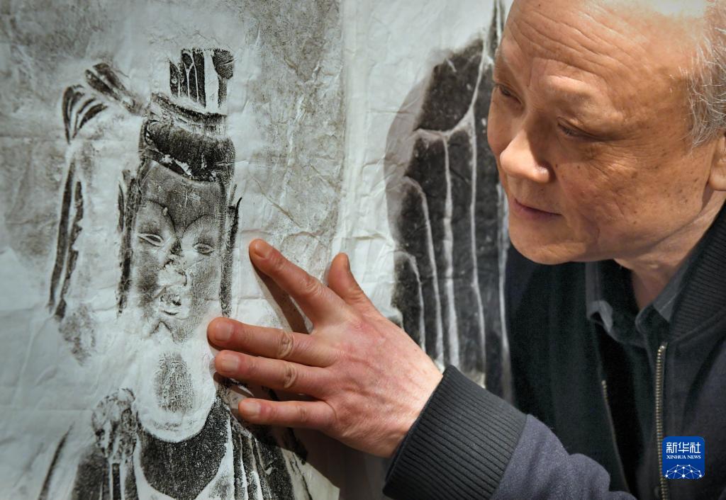 与传统的平面拓印不同,高浮雕拓印需要将湿透的宣纸沿立体雕像轮廓剪开,直压在各个部位,因此拓印后的宣纸呈碎片状,而李仁清则需要把成百上千张的碎片粘接在一起,形成一整幅平面作品。高浮雕传拓技艺将不可移动文物按1:1的比例转化为可移动文物,甚至可以将石刻上的裂隙、剥蚀等病害记录下来,为观察和保护文物提供准确信息。