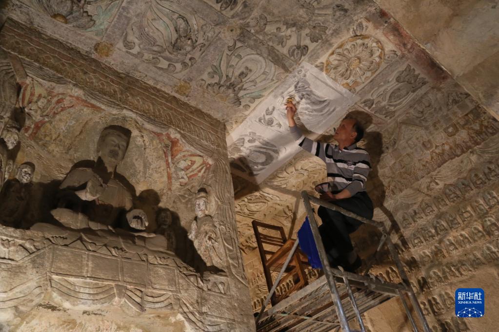 李仁清在巩义石窟寺进行拓印(资料照片)。