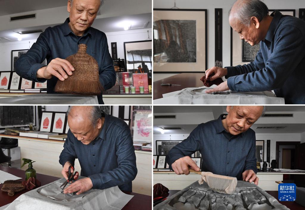 在位于郑州市金水区文化馆的工作室里,李仁清进行上纸、剪纸、砸刷等工序(拼版照片,11月16日摄)。